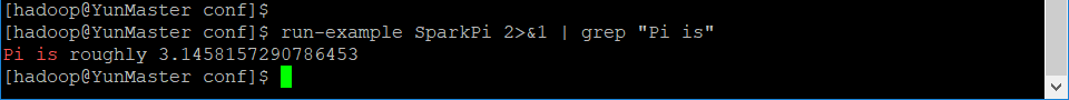 [hadoop@YunMaster conf]$ run-example SparkPi 2>&1 | grep "Pi is"