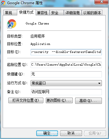 然后在目标里添加 --disable-features=SameSiteByDefaultCookies,CookiesWithoutSameSiteMustBeSecure