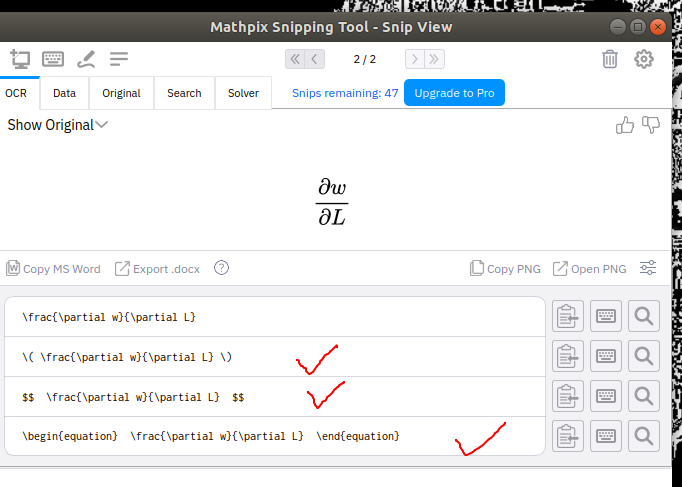 3. 将公式化为latex代码,这里推荐使用Mathpix_Snipping_Tool,如下图所示