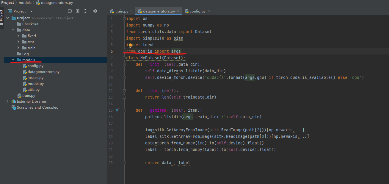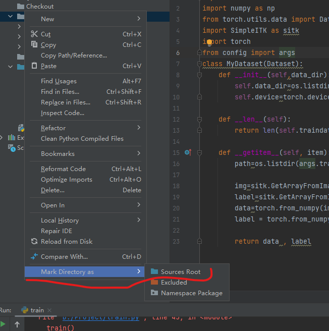 如上图所示,from config import args会报错,但用from models.config import args只要设置models为Source Root即可,如下![]