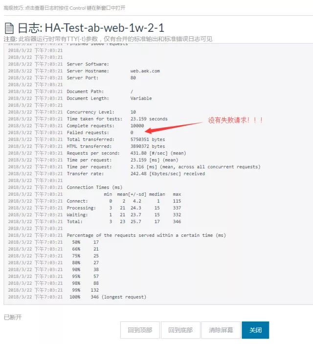 选择ab-web服务,将其克隆,在新服务里面把服务名改成ab-web-1w,在命令里面把请求个数参数调整为-n 10000,启动压测服务。等服务进入Running状态后,把hello-web服务扩容到3个后端,确保hello-web扩容的后端启动成功,并且在Traefik控制台确认hello-web后端已经有3个server,这个时候也可以手动刷新 http://web.aek.com 看看Server Name是否出现第三个容器。这时候压测应该还在进行汇总,回到ab-web-1w服务查看日志,等待压测结束。 可以看到没有失败请求,说明扩容期间负载均衡服务很稳定。