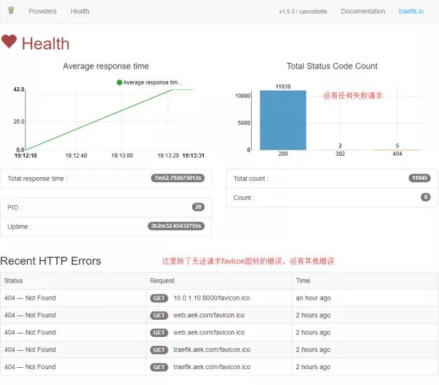 再来看看Traefik控制台的健康状态,除了无法请求favicon出现的404错误(Hello-web镜像里面没有放favicon.ico文件),没有其他错误。这也印证了Traefik服务的高可用。