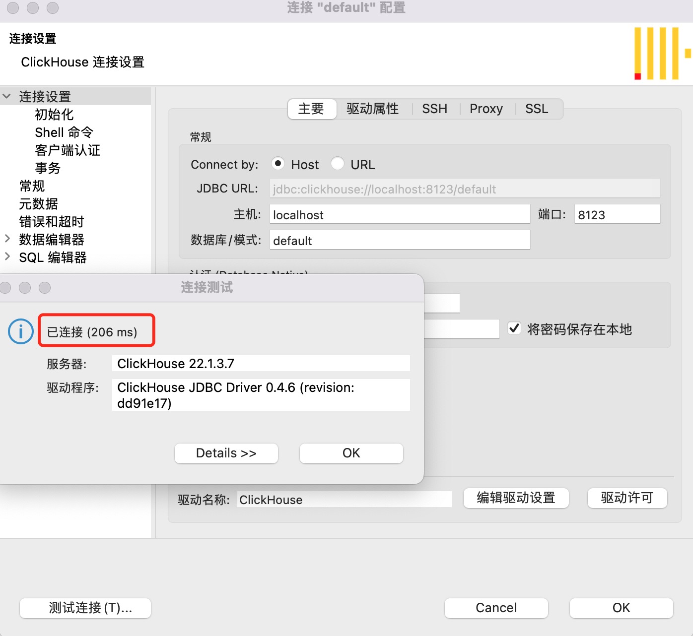 输入主机ip地址和端口号,端口号默认为8123,数据库默认为default,用户名默认为default,密码无需填写,如下图所示: