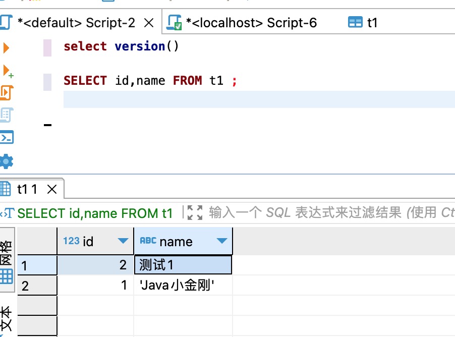 执行SQL脚本::insert into t1(id,name)values(2,'测试1');