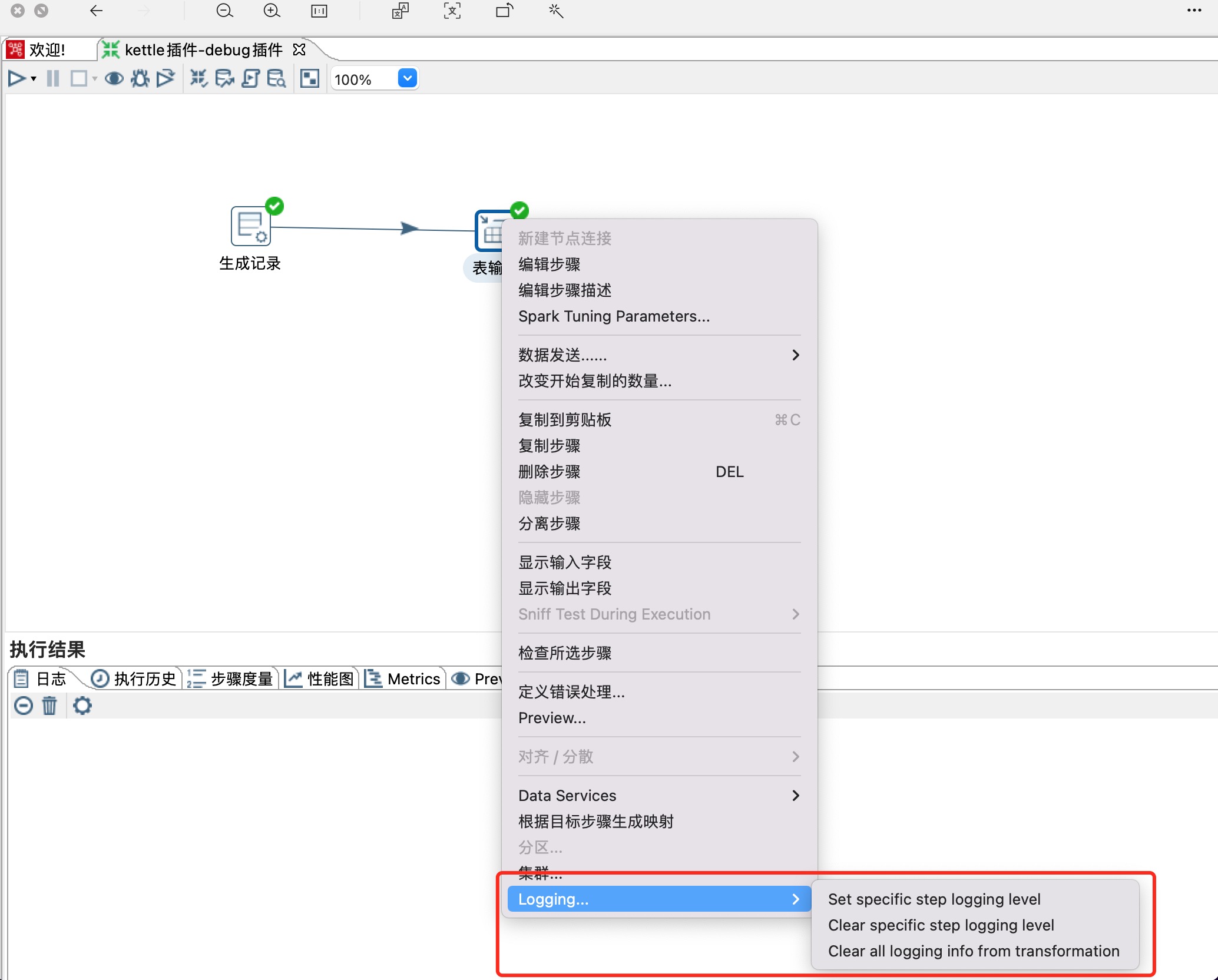 本次教程使用生成记录和表输出来演示如何debug,在相应的步骤上右键出现Logging菜单,说明我们的插件安装成功,如下图所示:
