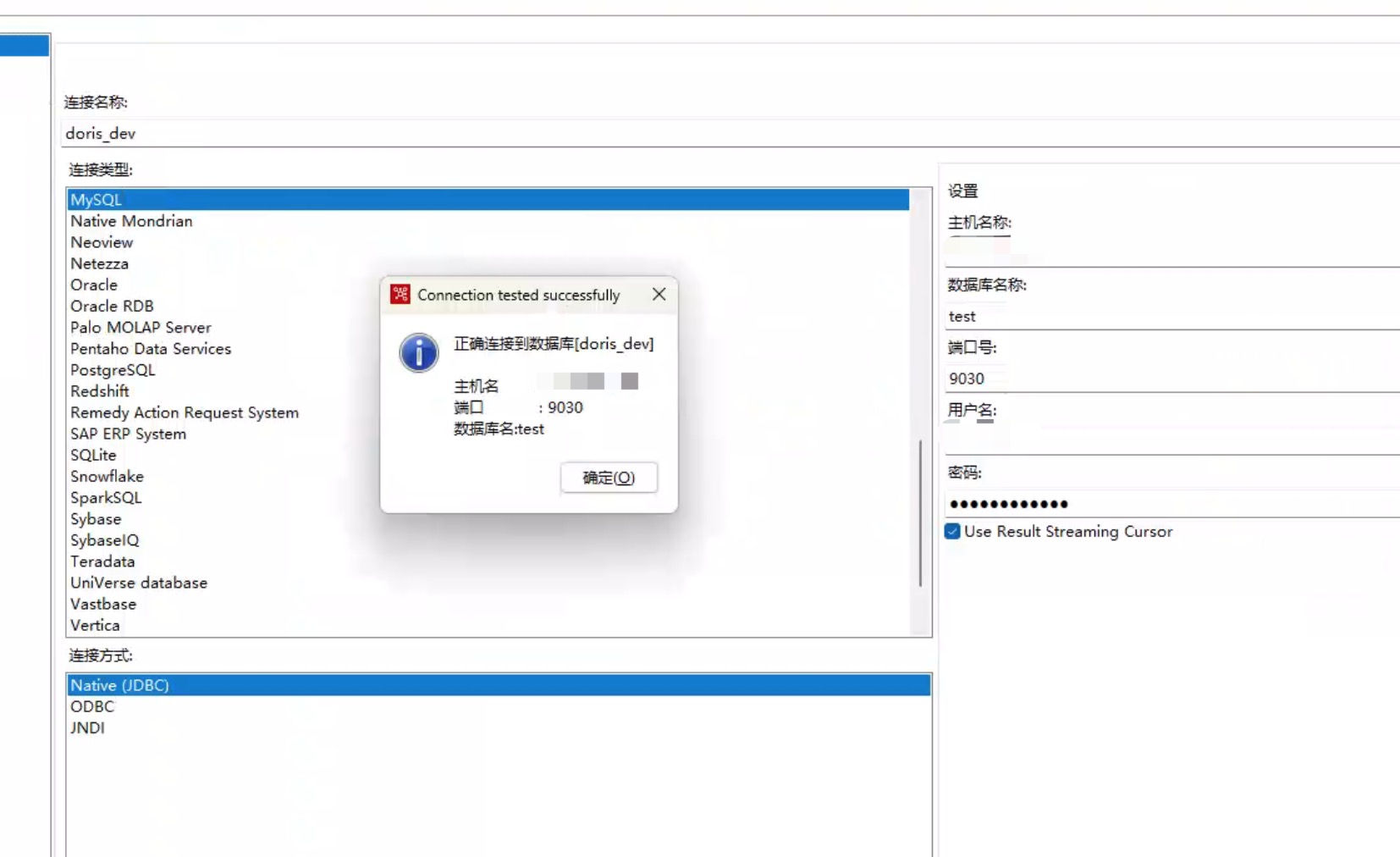 3、设置数据库连接,由于doris支持mysql协议,我们这次采用mysql连接类型进行连接,注意我们这里使用的端口是9030,如下图所示: