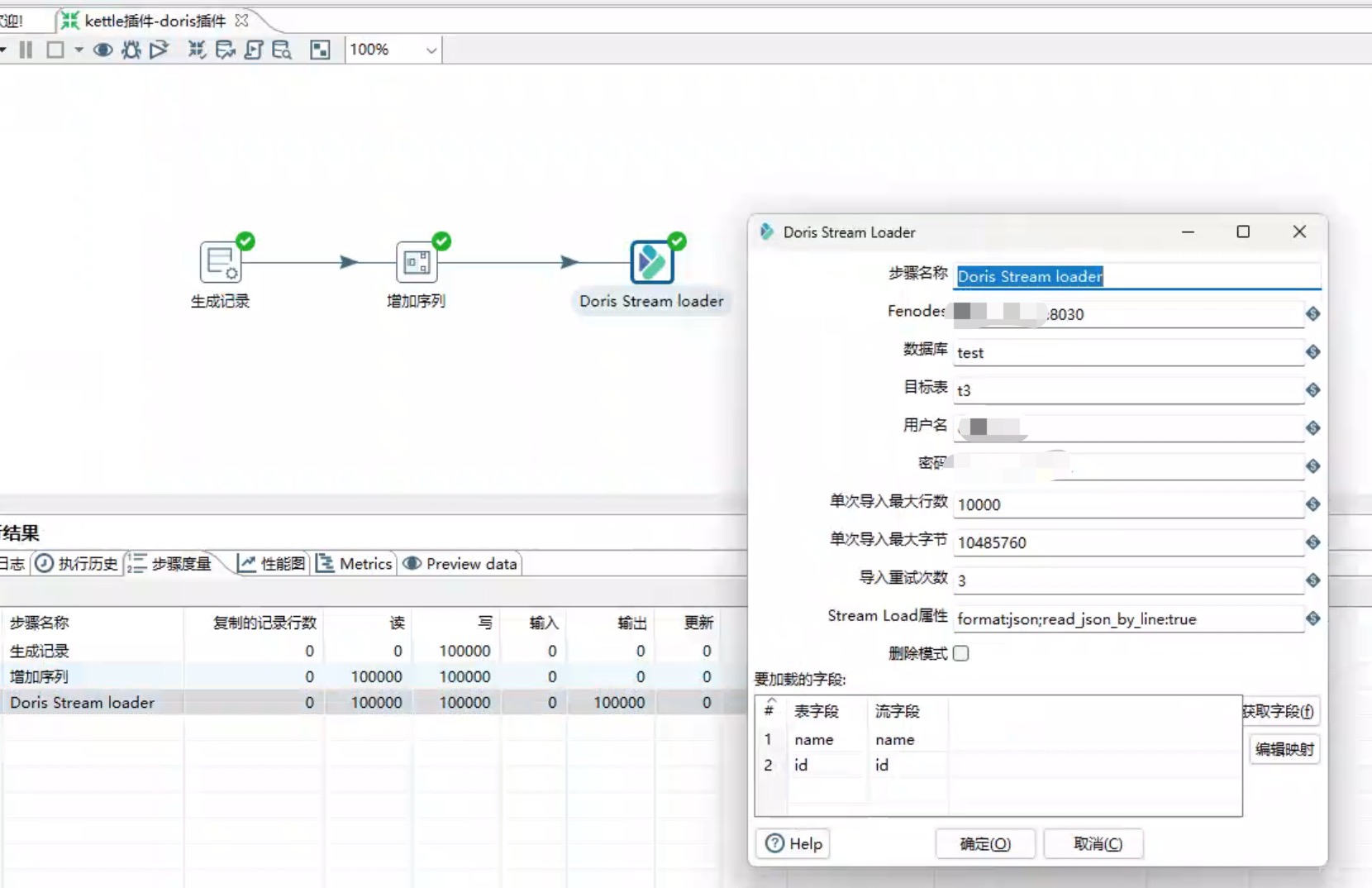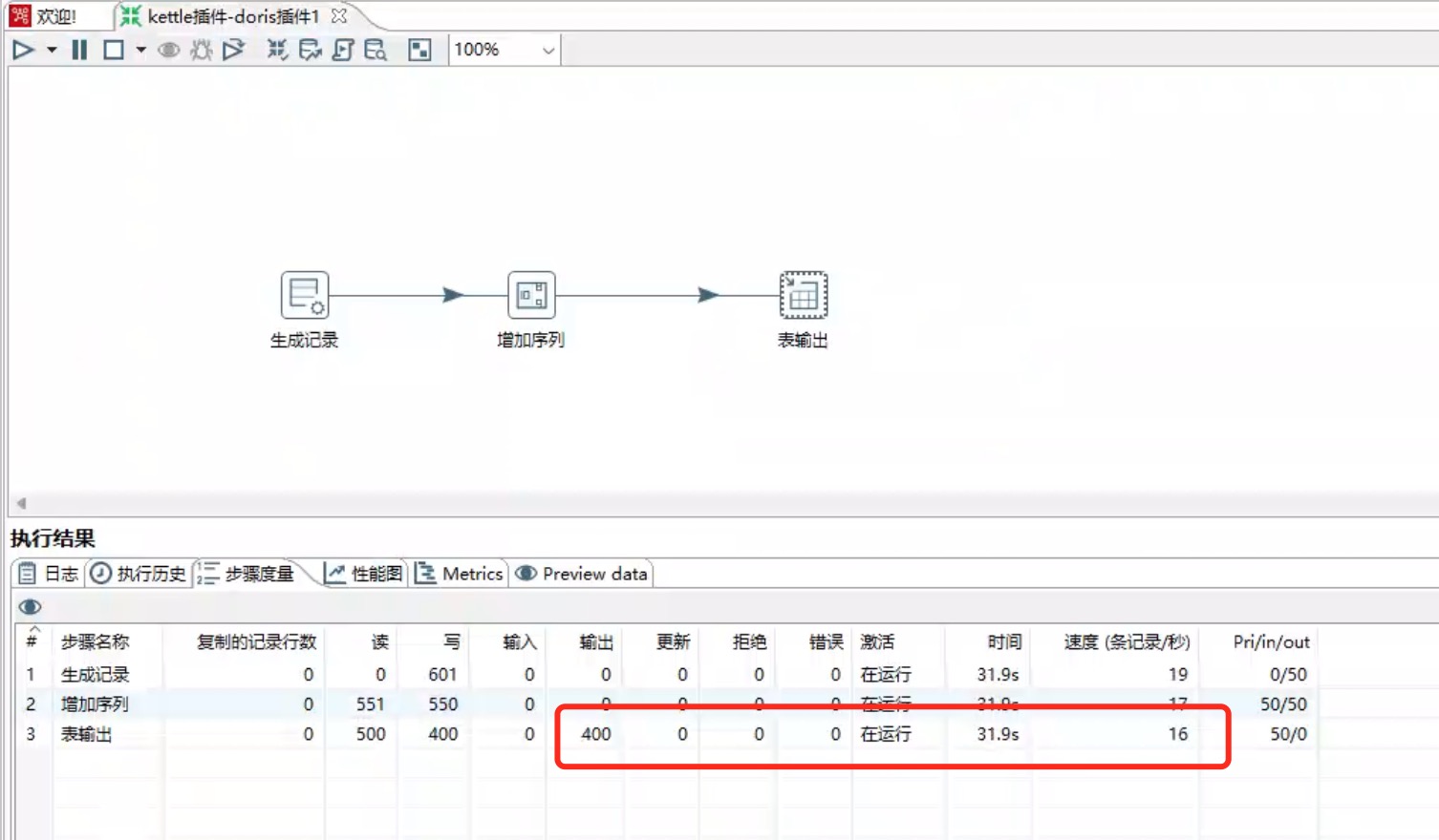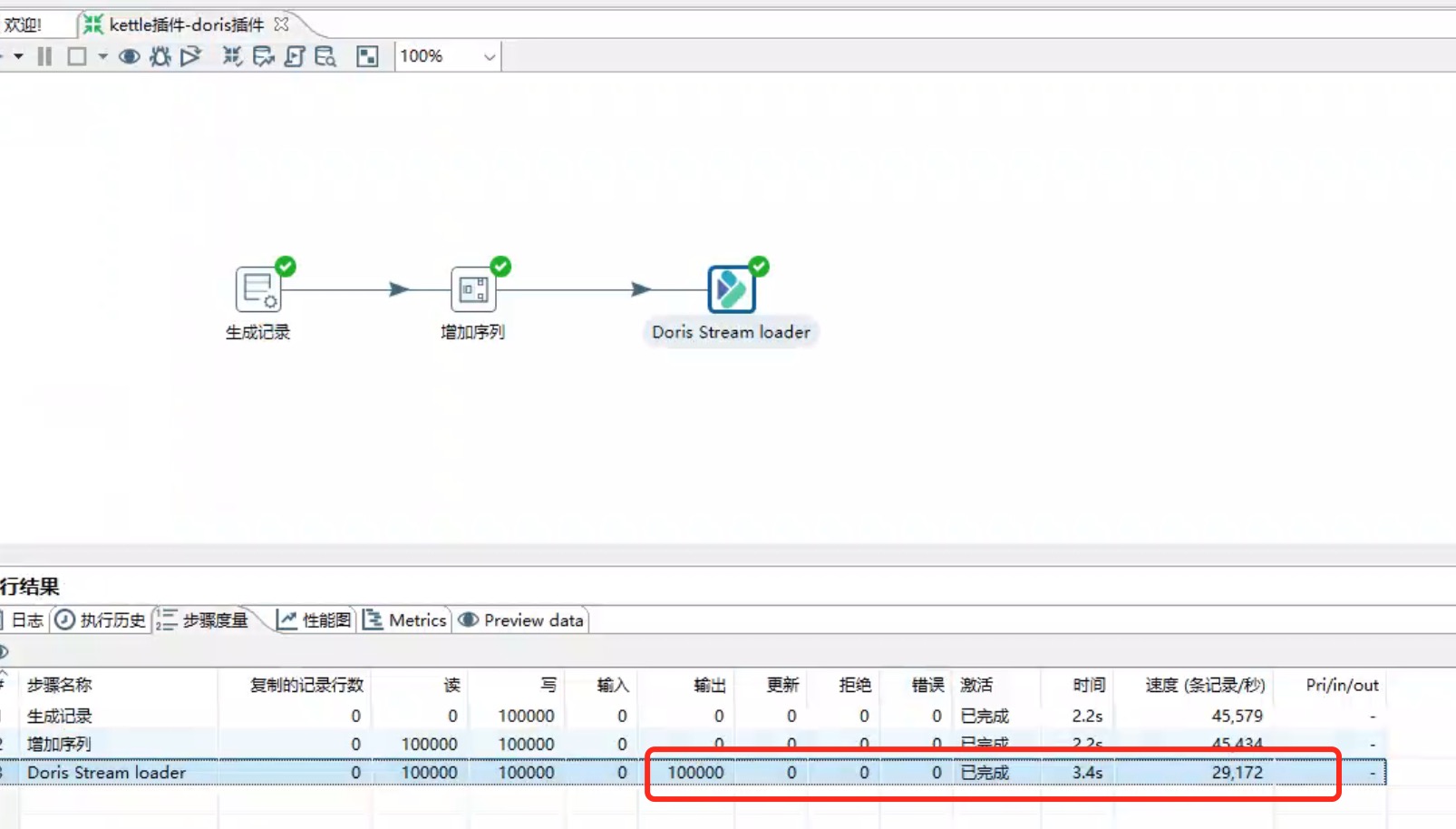 5、使用doris-stream-loader插件,将表输出步骤替换为doris-stream-loader,数据写入速度直接2.9万/秒,3.4秒写入了10万笔数据,如下图所示: