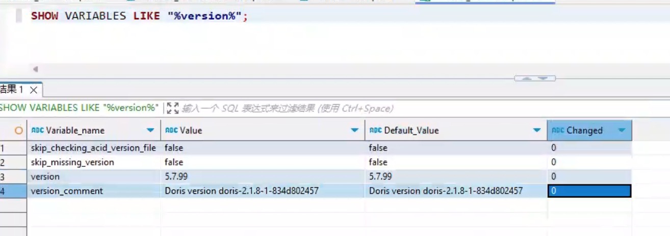 本次使用的doris的版本为2.1.8-xxx,如下图所示: