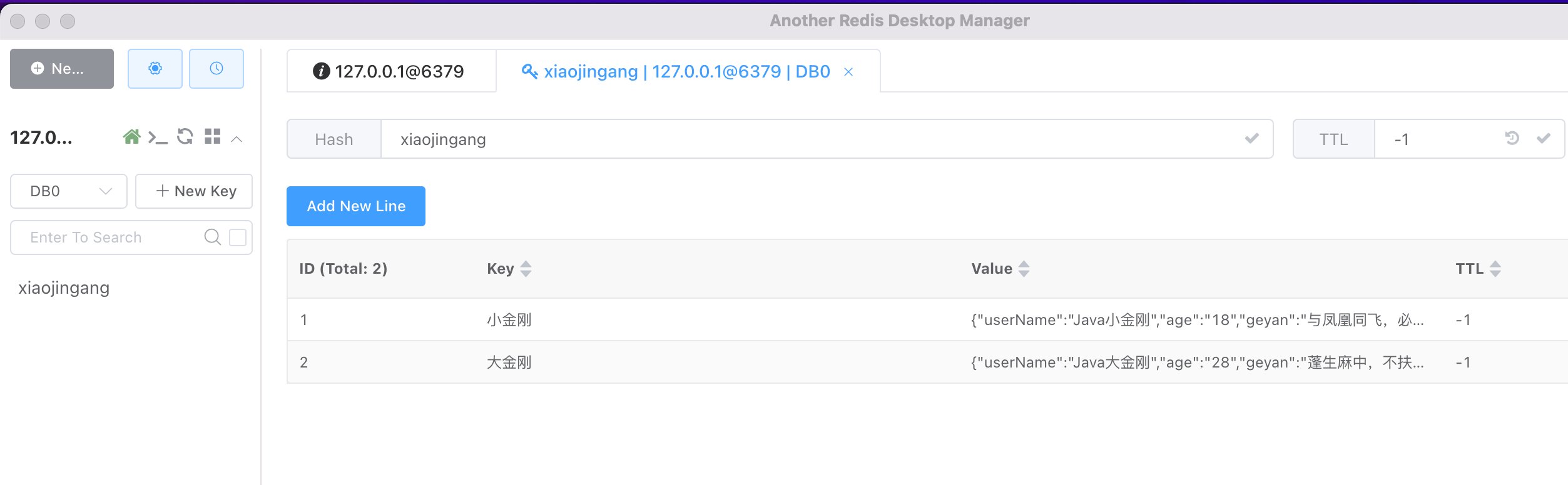 本地启动了一个redis的docker单体服务,然后使用redis desktop 客户端往redis中写入hash数据(hash key为xiaojingang,value值是键值对集合),如下图所示: