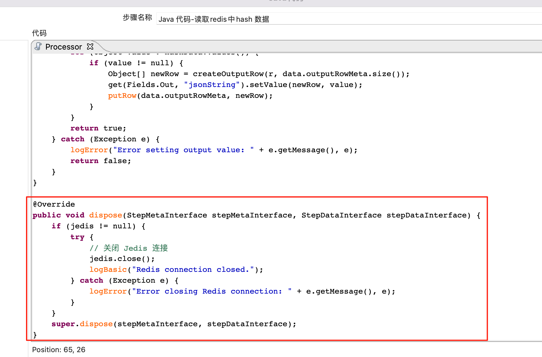 c、整个作业或者转换被手动停止或者由于其他原因需要停止时,系统会调用每个步骤的 dispose 方法来释放资源。
