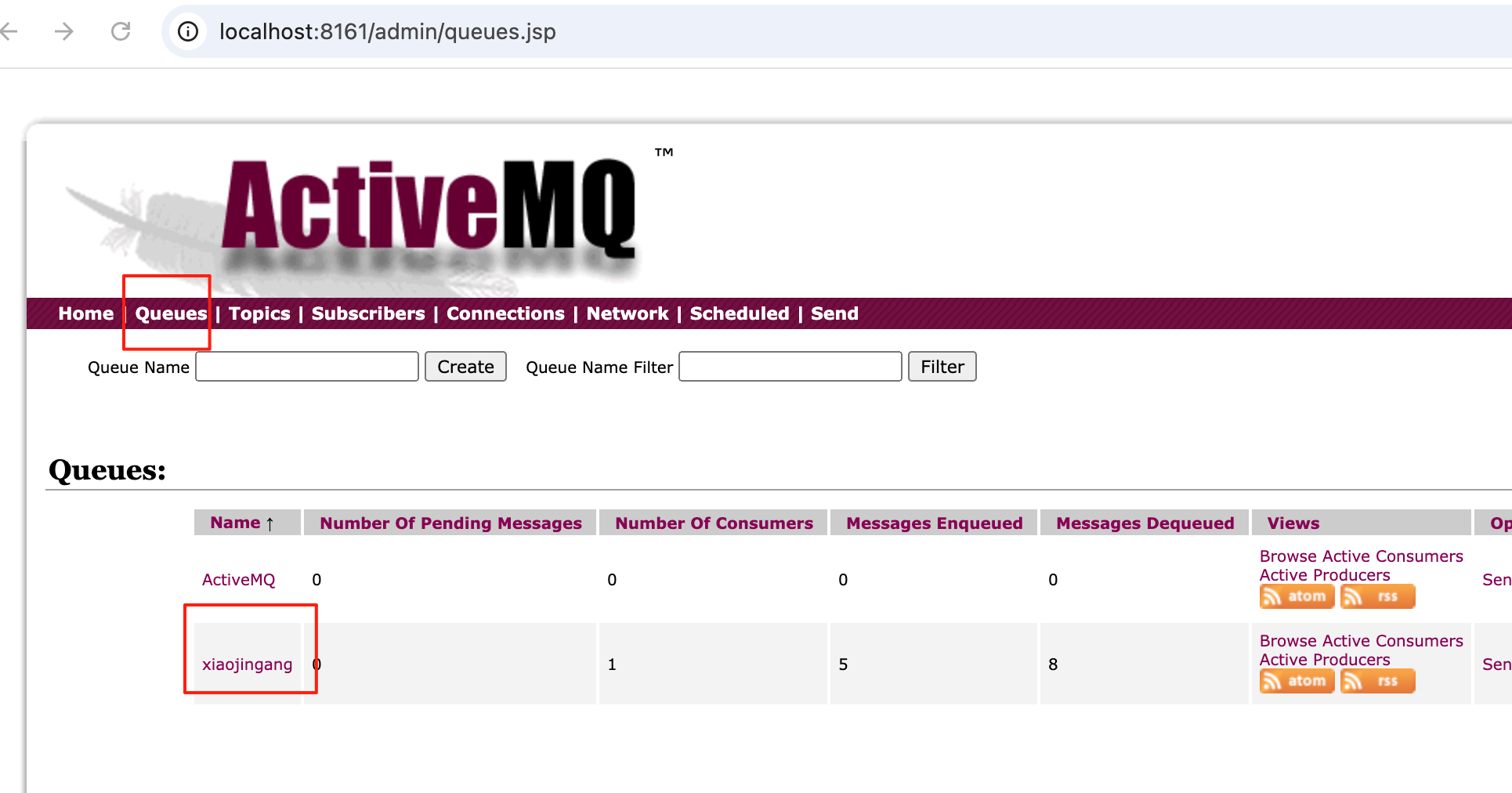 点击Queues, Queue Name 输入xiaojingang,点击按钮Create 创建队列。
