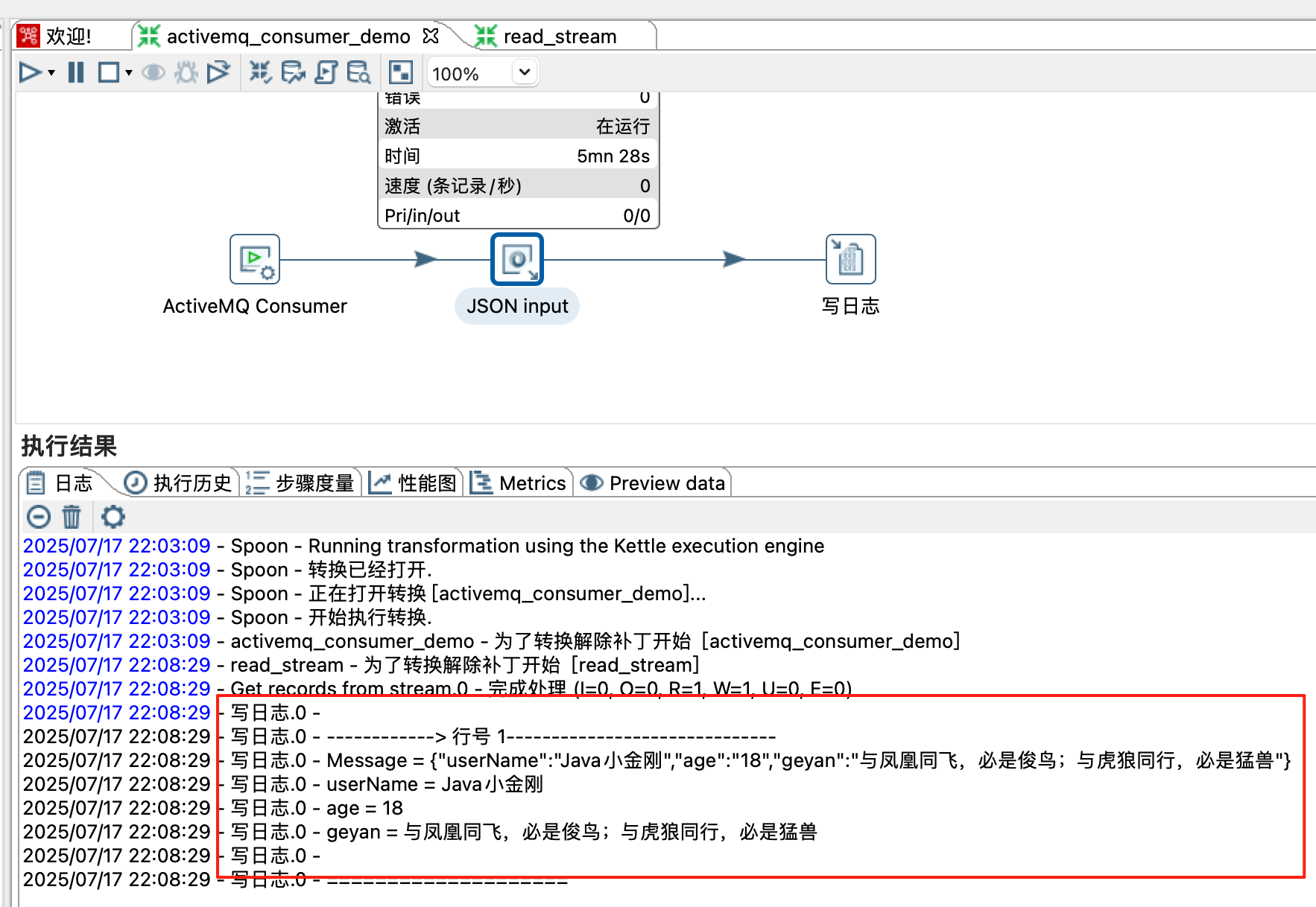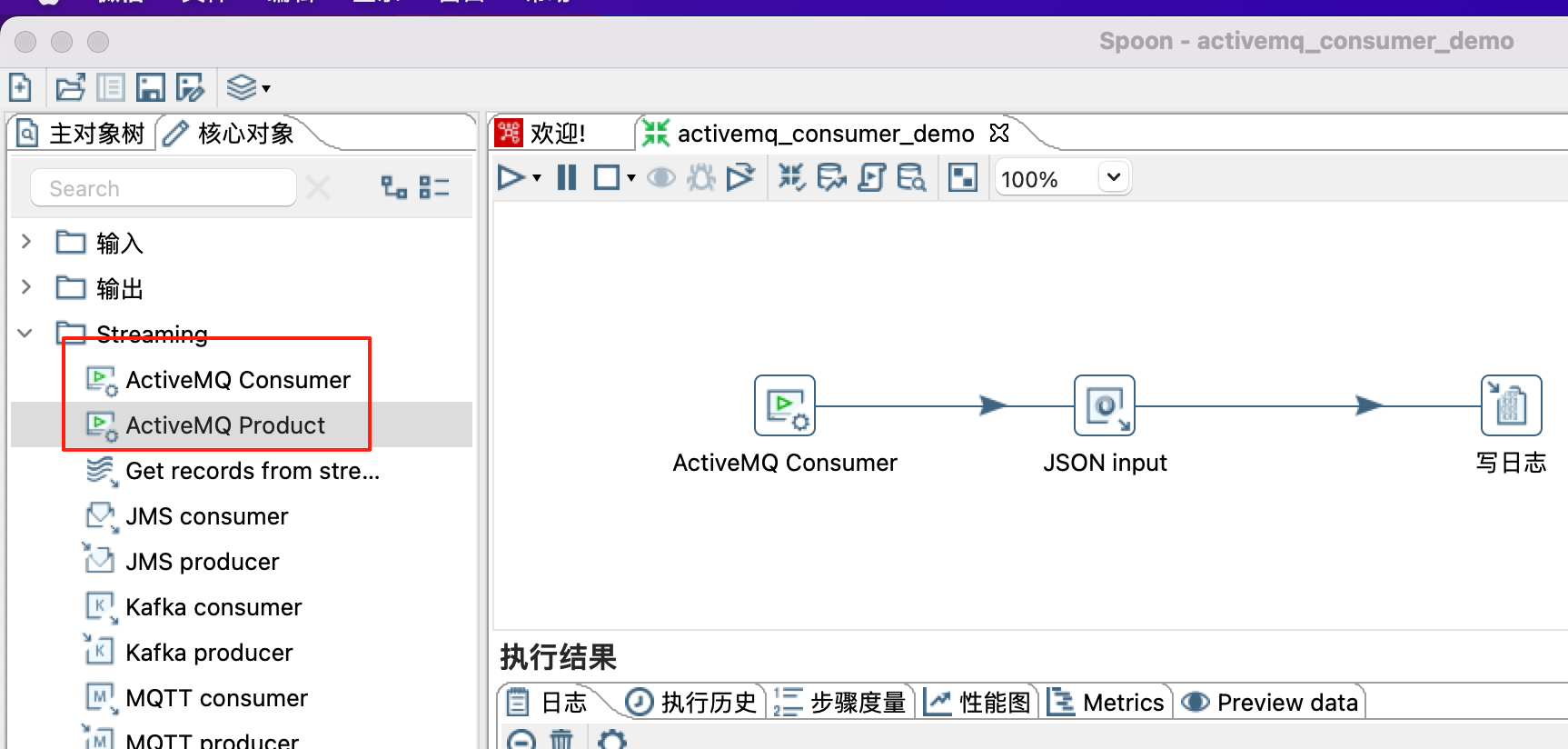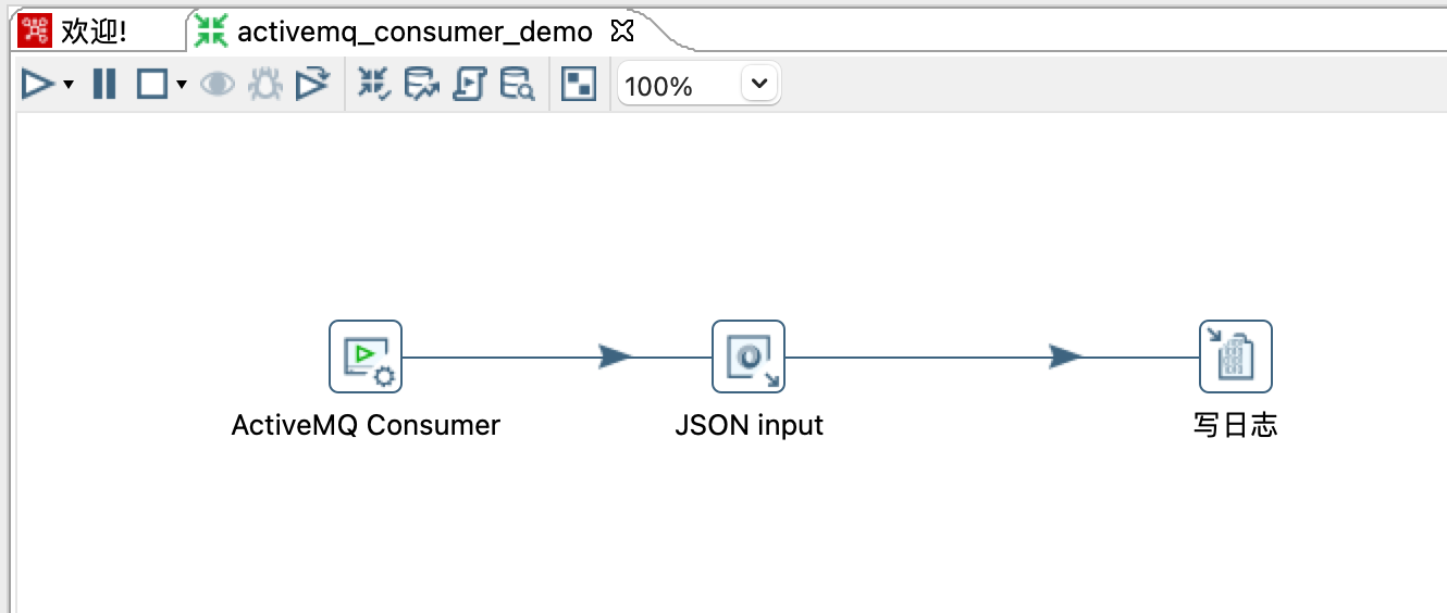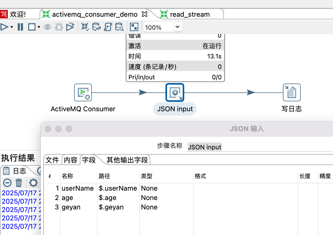 本次使用的步骤有ActiveMQ Consumer 、JSON input 和写日志三个步骤。