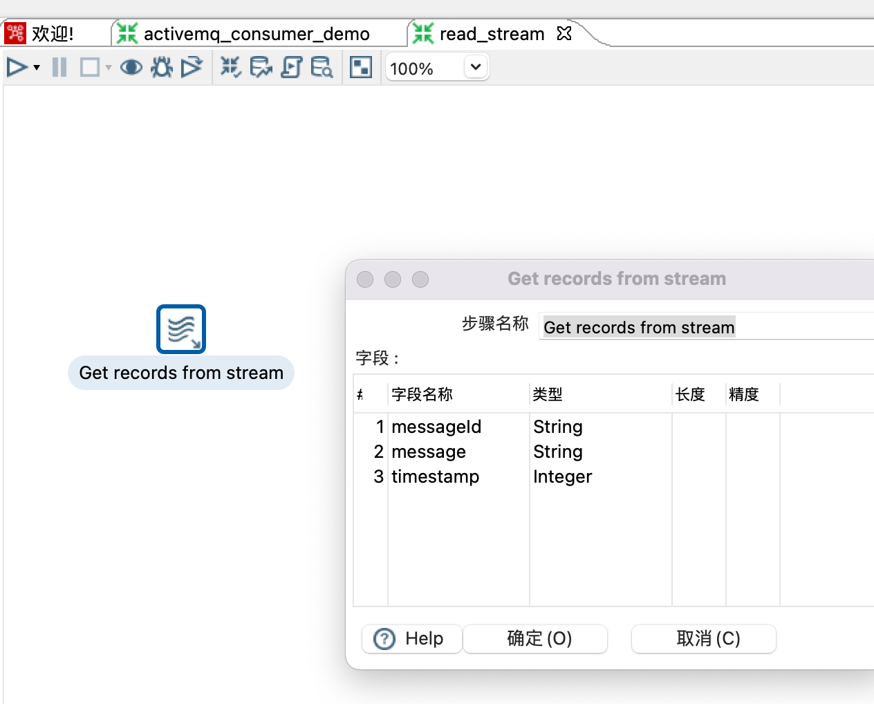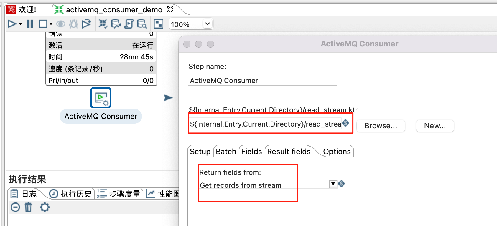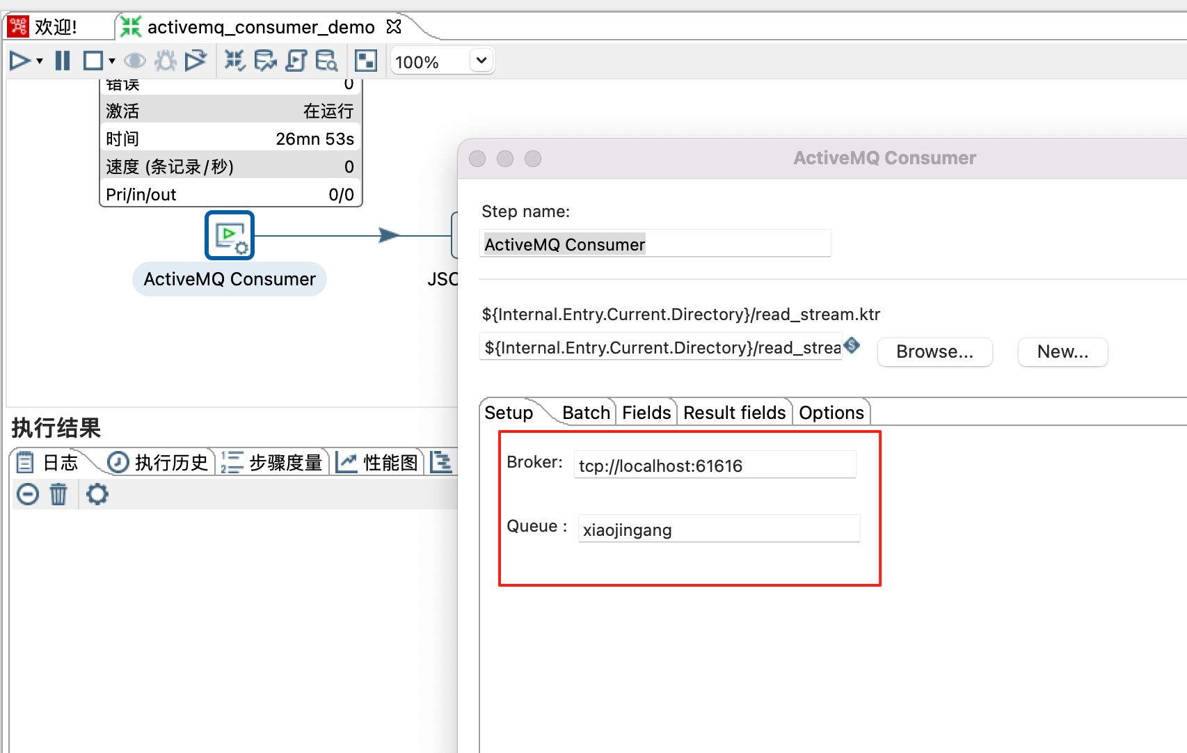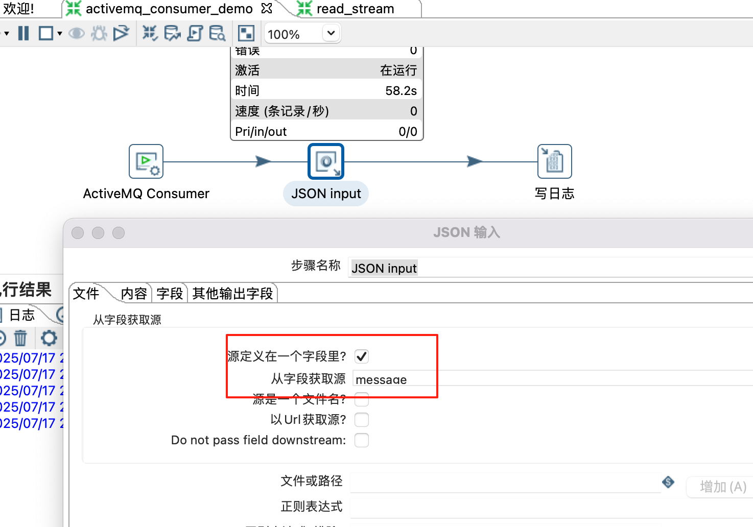 本次使用的步骤有ActiveMQ Consumer 、JSON input 和写日志三个步骤。