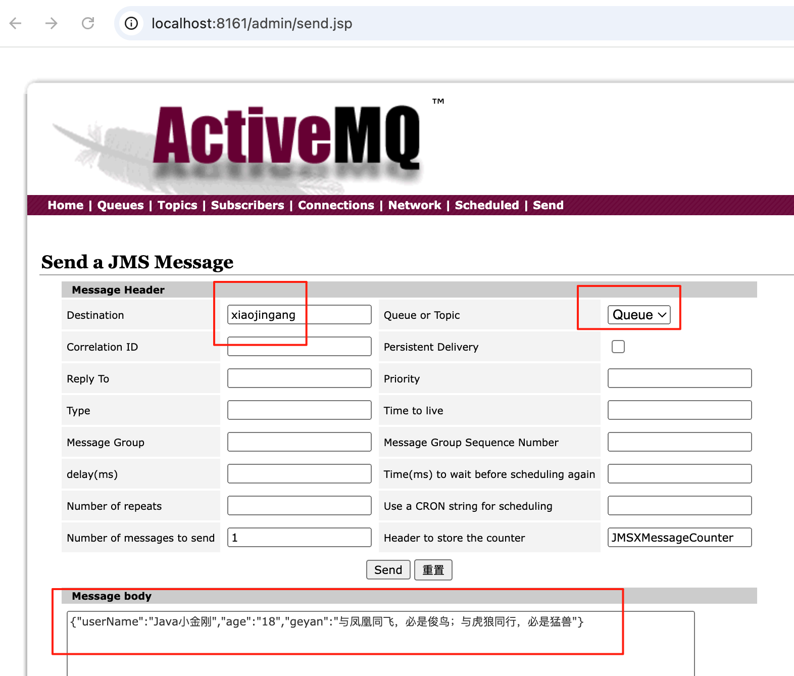 手动往ActiveMQ 发送消息,消息内容为{"userName":"Java小金刚","age":"18","geyan":"与凤凰同飞,必是俊鸟;与虎狼同行,必是猛兽"},如下图所示: