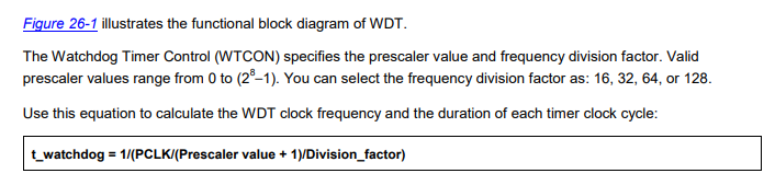 PCLK经过两级的分频之后,才发送给WTCNT,分频配置分别在WTCON[15:8]和WTCON[4:3]。