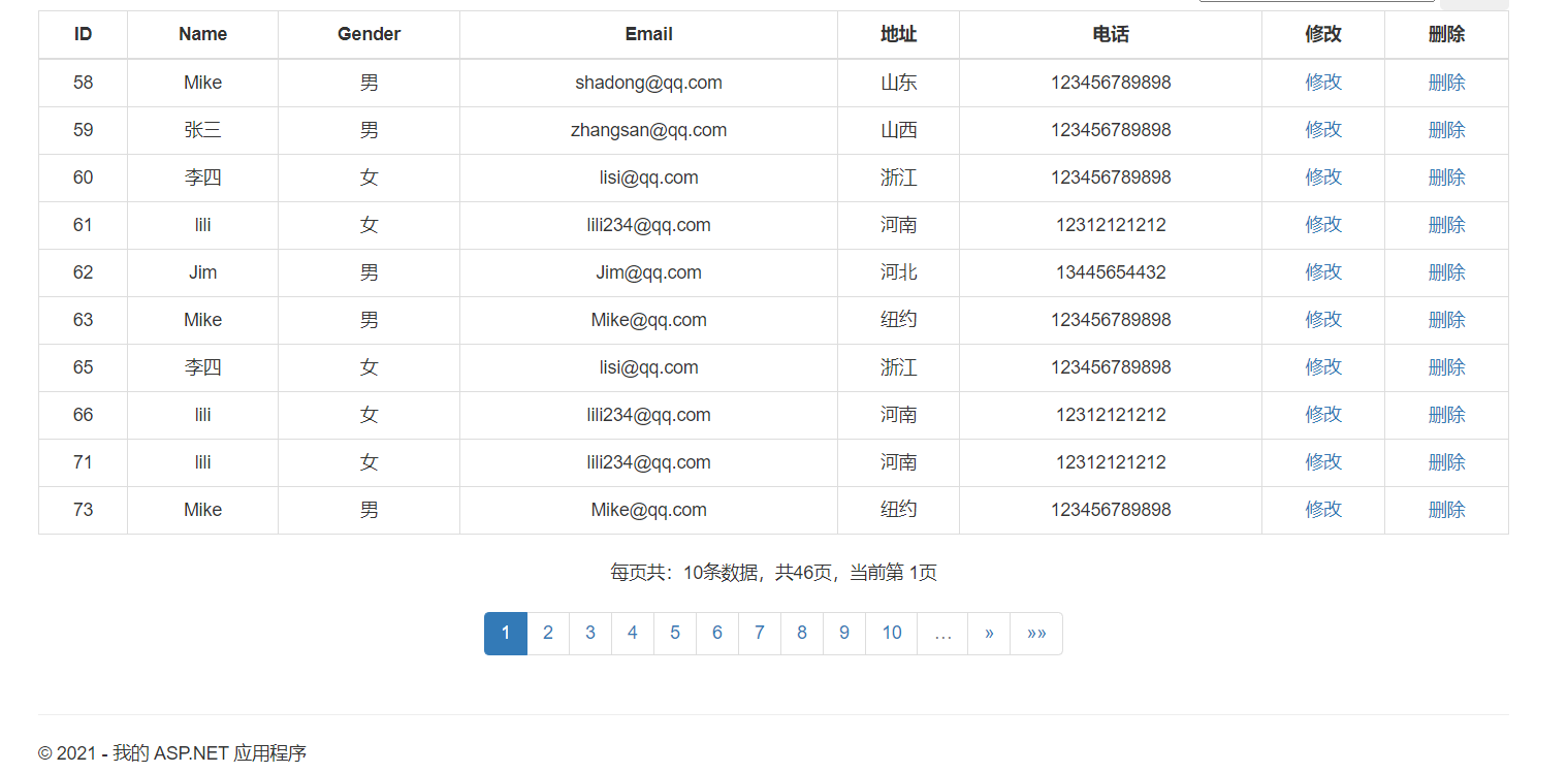 <table class="table table-bordered table-hover text-center"> <thead> <tr> <th>ID</th> <th>Name</th> <th>Gender</th> <th>Email</th> <th>地址</th> <th>电话</th> <th>修改</th> <th>删除</th> </tr> </thead> <tbody> @foreach (var item in Model) { <tr> <td>@Html.DisplayFor(modelItem => item.UserID)</td> <td>@Html.DisplayFor(modelItem => item.UserName)</td> <td>@Html.DisplayFor(modelItem => item.Gender)</td> <td>@Html.DisplayFor(modelItem => item.Email)</td> <td>@Html.DisplayFor(modelItem => item.Address)</td> <td>@Html.DisplayFor(modelItem => item.Tel)</td> <td><a href="/Home/del/@item.UserID">修改</a></td> <td><a href="/Home/shanchu/@item.UserID">删除</a></td> </tr> } </tbody> </table> <div style="text-align:center"> 每页共:@(Model.PageSize)条数据,共@(Model.PageCount)页,当前第 @(Model.PageNumber)页 @Html.PagedListPager(Model, id => Url.Action("fenye", new { id }))//注意此处id,与Action参数对应 </div>