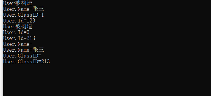 public class User { public User() { Console.WriteLine($"{this.GetType().Name}被构造"); } public int Id { get; set; } public string Name { get; set; } public string ClassID; }
