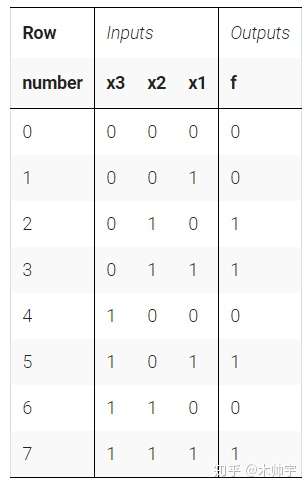 - 例子:三输入一输出,输出为 1 时有四个输入组合,输出为 0 时,有四个输入组合