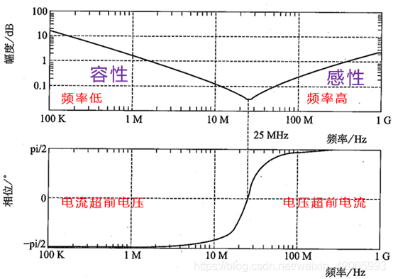 在频率较低时,感抗小于容抗,复阻抗的相位为负值,说明电流超前电压,电容充电。