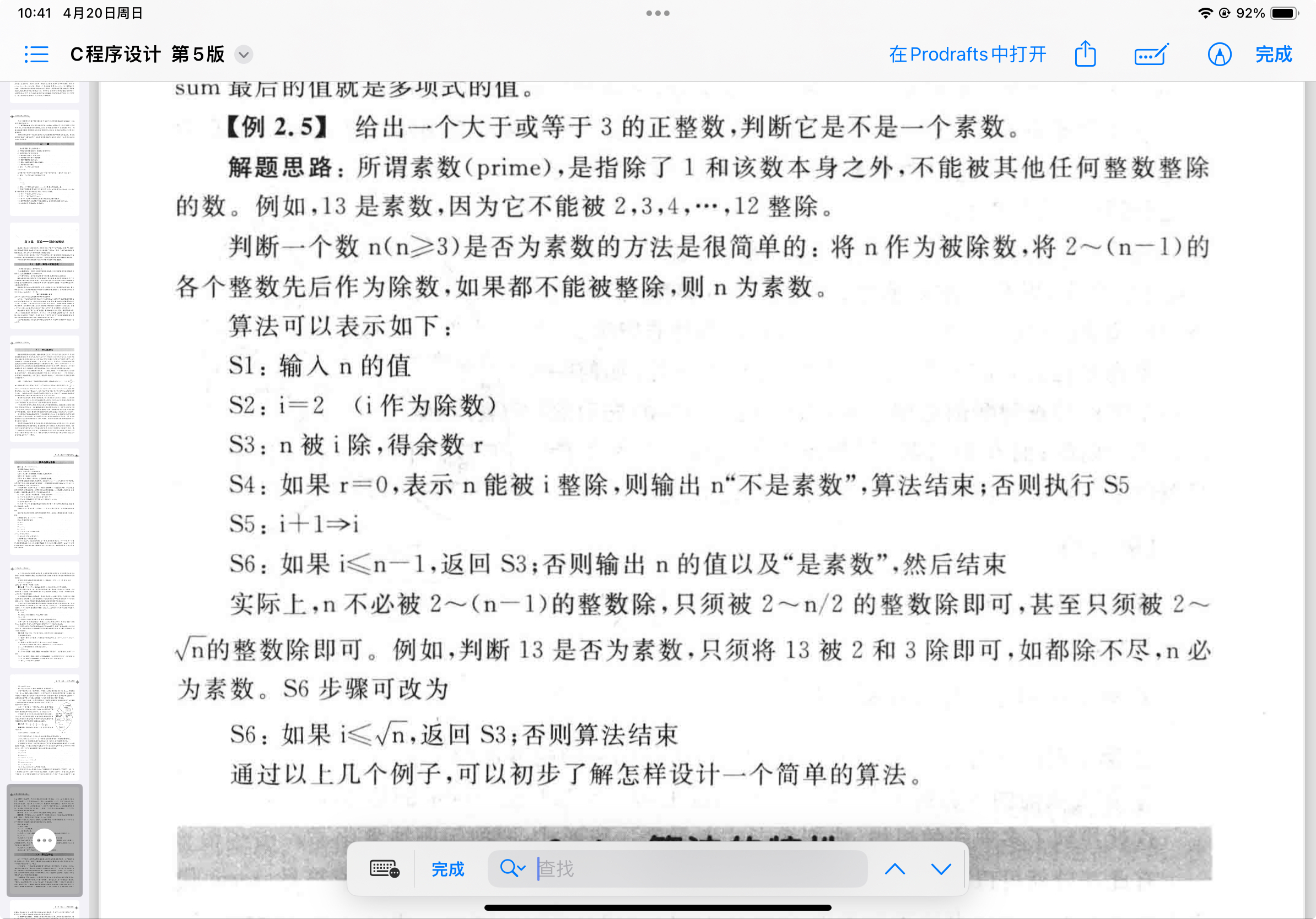 // 分析:1.此程序累加式中的规律:从首项1开始,依次乘以1/2就是下一项,但注意C程序中的1/2值为0; // 2.定义循环变量i,初值为1.0。因为循环的结束条件为某一项的值"i < 0.0001",所以循环继续的条件为其反面情况"i >= 0.0001"; // 3.定义累加变量sum,初值为0.0,每经历一次循环就将i累加到sum中,同时i的值自动减半 #include <stdio.h> int main(){ float t = 1.0; double sum = 0; while (t >= 0.0001) { sum = sum + t; t = t / 2; // 注意将t定义成浮点型,如果是整型的话t/2结果为整数,计算结果不准确 } printf(“sum=%f\n”, sum); return 0; }- 6.(变式)计算 1 - 1/3 + 1/5 - 1/7 + 1/9 - … 的和,直到某一项的绝对值小于 0.0001。