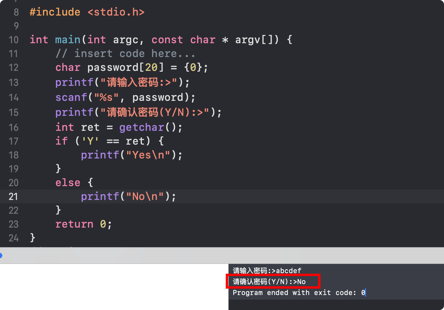 // 解决方法1:在scanf()下方加一条getchar()以读取'\n' #include <stdio.h> int main(int argc, const char * argv[]) { // insert code here... char password[20] = {0}; printf("请输入密码:>"); scanf("%s", password); getchar(); // 读取了\n printf("请确认密码(Y/N):>"); int ret = getchar(); if ('Y' == ret) { printf("Yes\n"); } else { printf("No\n"); } return 0; } // 以上代码若输入"abcd ef\n",依然会出现异常,因为scanf()读到空格就会停止 // 解决方法2 #include <stdio.h> int main(int argc, const char * argv[]) { // insert code here... char password[20] = {0}; printf("请输入密码:>"); scanf("%s", password); int ch = 0; while ((ch = getchar()) != '\n') { // 清空缓冲区中的其他字符 ; } printf("请确认密码(Y/N):>"); int ret = getchar(); if ('Y' == ret) { printf("Yes\n"); } else { printf("No\n"); } return 0; }- 4.输出数字字符