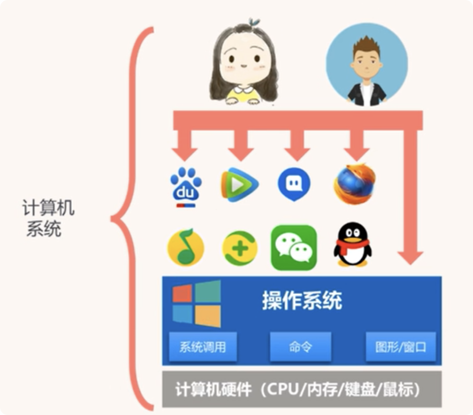 计算机低层由CPU、硬盘、主板、内存条、网卡等硬件组成,硬件之上是驱动程序和操作系统,在两者配合下硬件可以协同工作。应用程序安装在操作系统上,用户通过操作应用程序和操作系统来间接调用硬件资源