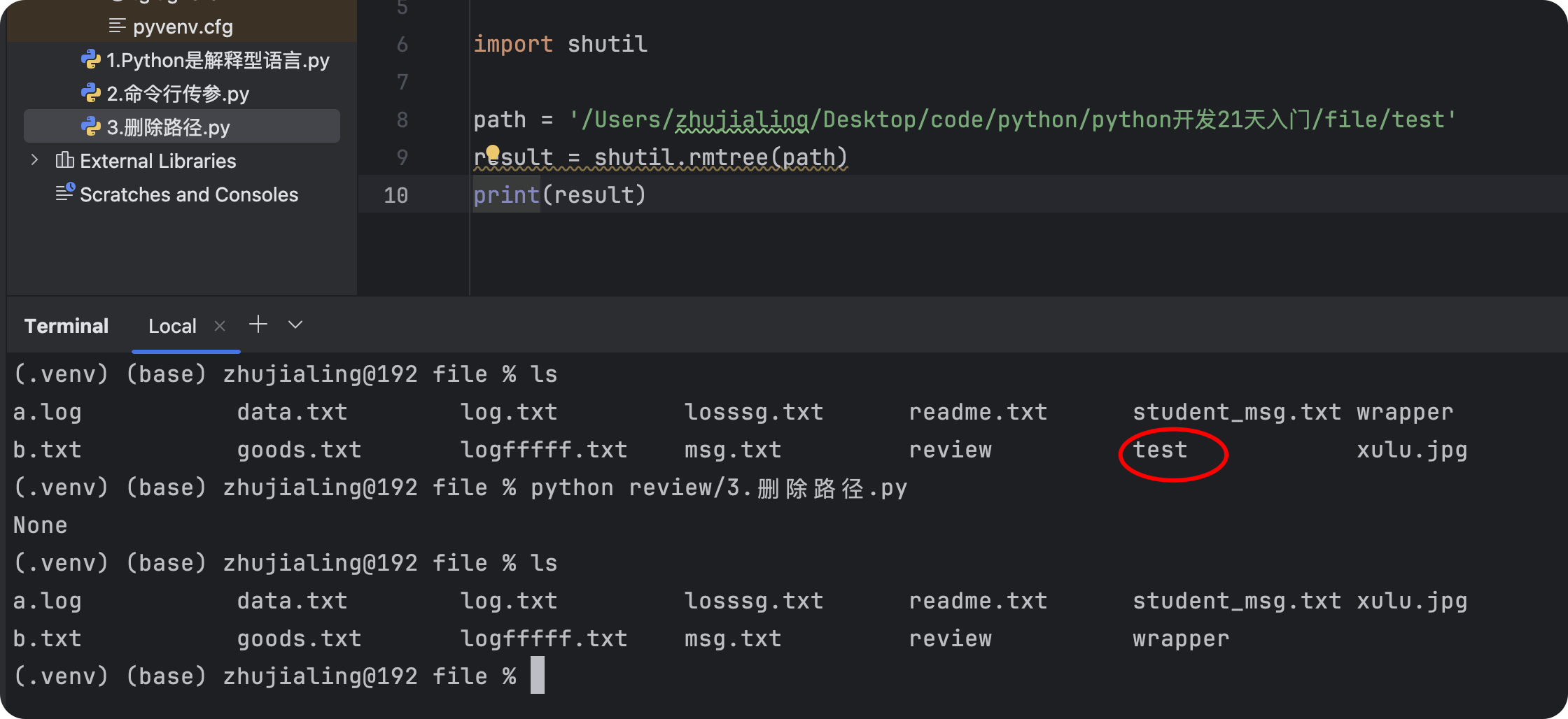 # r用于原生显示,即不将转义字符进行转义,保持它们本来的含义 v = r'/Users/zhujialing/Desktop/code/python/file/river.jpg ' print(os.path.dirname(v)) # /Users/zhujialing/Desktop/code/python/file v = r'/Users/zhujialing/Desktop/code/python/python开发21天入门/file' print(os.path.dirname(v)) # /Users/zhujialing/Desktop/code/python/python开发21天入门 v = r'/Users/zhujialing/Desktop/code/python/python开发21天入门/file/' print(os.path.dirname(v)) # /Users/zhujialing/Desktop/code/python/python开发21天入门/file v = 'al\nex' # 默认将\n当换行 print(v) v = 'al\\nex' print(v) v = r'al\nex' # 推荐使用带r的方式 print(v) - 5.os.path.join(param1, param2, param3, ...)