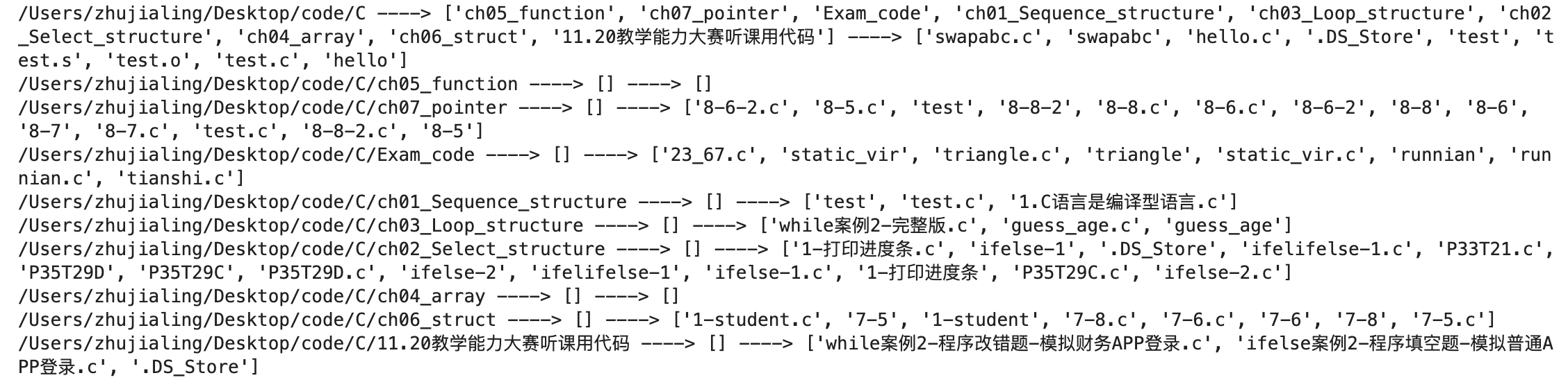 result = os.walk(r'/Users/zhujialing/Desktop/code/C') print(result) # <generator object walk at 0x1501ed8b0> 结果返回一个生成器 for a, b, c in result: # a是正在查看的目录 b是此目录下的文件夹 c是此目录下的文件 print(a, '---->', b, '---->', c)![]()