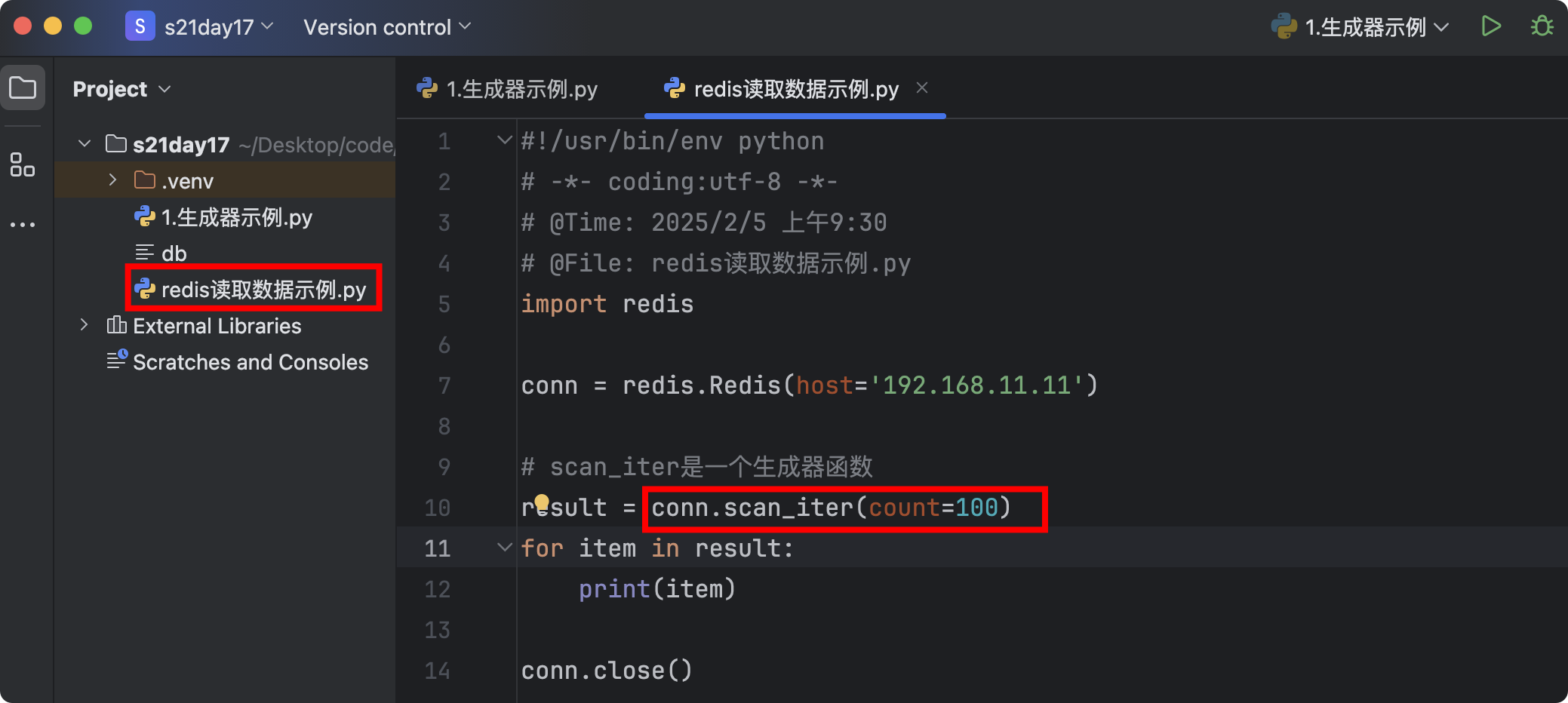 def func(): print('f1') yield 1 print('f2') yield 2 print('f3') yield 100 print('f4') # 函数的内部代码不会执行,返回一个生成器对象 v1 = func() # 生成器可以被for循环,一旦开始循环,那么函数内部代码就会开始执行 for item in v1: print(item) # f1 第1次循环,执行函数,打印 # 1 然后返回1 # f2 第2次循环,接着上次yield后的位置继续执行,打印 # 2 然后返回2 # f3 第3次循环,接着上次yield后的位置继续执行,打印 # 100 然后返回100 # f4 第4次循环,接着上次yield后的位置继续执行,打印 count = 0 for item in v1: # v1是上一段代码中返回的生成器对象 print(item) count += 1 if count == 2: break # f1 # 1 # f2 # 2 def func(): count = 1 while True: yield count count += 1 val = func() # for item in val: # print(item) # 死循环 def func(): return 1 if 1 != 1: yield 1 yield 9 v = func() print(v, type(v)) # <generator object func at 0x141a36140> <class 'generator'> # 只要函数中有yield就是生成器,不用管yield语句能否执行 def func(): return 1 yield 1 yield 9 v = func() for item in v: print(item) # 没有任何输出 def func(): yield 9 return 111 yield 10 v = func() for item in v: print(item) # 输出9 def func(): count = 1 while True: yield count count += 1 if count == 100: return val = func() for item in val: print(item, " ", end="") # 顺序打印1-99- 3.以读文件模仿读取redis示例