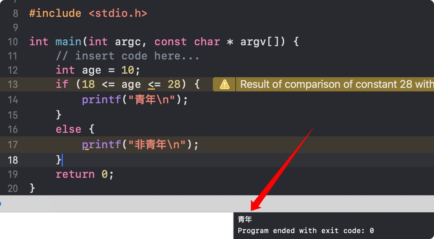 // 正确写法:age >= 18 && age <= 28 // 错误写法:18 <= age <= 28,当 age=10 时,不符合"青年"的标准,但程序会打印青年。具体原因可参考上一题![]()
