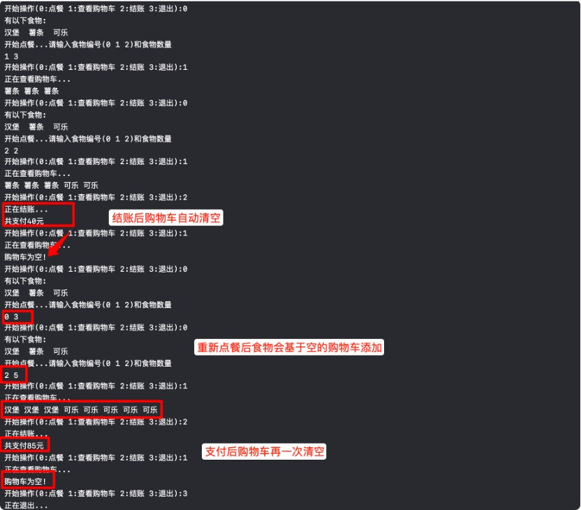 printf("开始操作(0:点餐 1:查看购物车 2:结账 3:退出):");