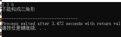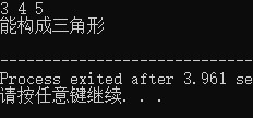 1 #include <stdio.h> 2 int main() 3 { 4 float a, b, c; 5 scanf("%f%f%f", &a, &b, &c); 6 if(a+b>c&&a+c>b&&b+c>a) 7 printf("能构成三角形\n"); 8 else 9 printf("不能构成三角形\n"); 10 return 0; 11 }
