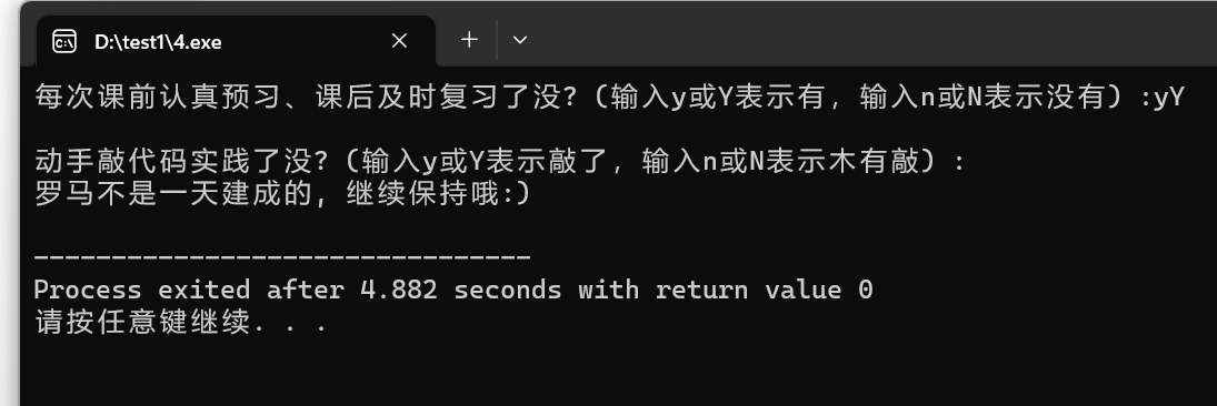 1 #include <stdio.h> 2 int main() 3 { 4 char ans1, ans2; // 用于保存用户输入的答案 5 printf("每次课前认真预习、课后及时复习了没? (输入y或Y表示有,输入n或N表示没有) :"); 6 ans1 = getchar(); // 从键盘输入一个字符,赋值给ans1 7 getchar(); // 思考这里为什么要加这一行。试着去掉这一行,看看对运行有没有影响。 8 printf("\n动手敲代码实践了没? (输入y或Y表示敲了,输入n或N表示木有敲) : "); 9 ans2 = getchar(); 10 if ((ans1==121||89)&&(ans2==89||121)) // 待补足,判断用户回答ans1和ans2都是小写y或大写Y 11 printf("\n罗马不是一天建成的, 继续保持哦:)\n"); 12 else 13 printf("\n罗马不是一天毁灭的, 我们来建设吧\n"); 14 return 0; 15 }