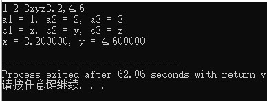 1 #include<stdio.h> 2 int main() 3 { 4 double x, y; 5 char c1, c2, c3; 6 int a1, a2, a3; 7 scanf("%d%d%d",&a1,&a2,&a3); 8 printf("a1 = %d, a2 = %d, a3 = %d\n",a1,a2,a3); 9 scanf("%c%c%c", &c1, &c2, &c3); 10 printf("c1 = %c, c2 = %c, c3 = %c\n", c1, c2, c3); 11 scanf("%lf,%lf", &x, &y); 12 printf("x = %lf, y = %lf\n",x, y); 13 return 0; 14 }