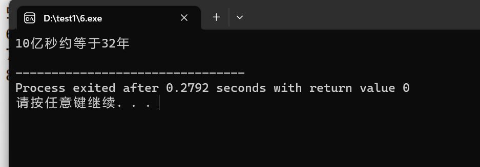 1 #include <stdio.h> 2 int main() 3 { 4 int year,a=1000000000; 5 year=(double)(a)/(60*60*24*365)+0.5; 6 printf("10亿秒约等于%d年\n", year); 7 return 0; 8 }