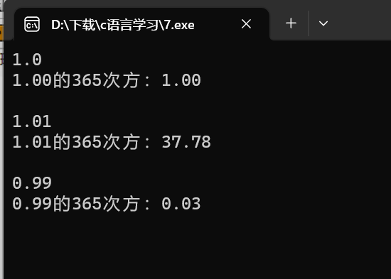 1 #include<stdio.h> 2 #include<math.h> 3 int main() 4 { 5 double x,ans; 6 while(scanf("%lf",&x)!=EOF) 7 { 8 ans=pow(x,365); 9 printf("%.2f的365次方:%.2f\n",x,ans); 10 printf("\n"); 11 } 12 return 0; 13 }