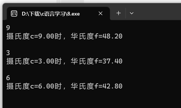 1 #include<stdio.h> 2 #include<math.h> 3 int main() 4 { 5 double c,f; 6 while(scanf("%lf",&c)!=EOF) 7 { 8 f=9*c/5+32; 9 printf("摄氏度c=%.2f时,华氏度f=%.2f\n",c,f); 10 printf("\n"); 11 } 12 return 0; 13 }