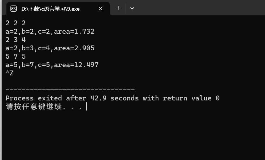 1 #include<stdio.h> 2 #include<math.h> 3 int main() 4 { 5 double s,area; 6 int a,b,c; 7 while(scanf("%d%d%d",&a,&b,&c)!=EOF) 8 { 9 s=(double)(a+b+c)/2; 10 area=sqrt(s*(s-a)*(s-b)*(s-c)); 11 printf("a=%d,b=%d,c=%d,area=%.3lf",a,b,c,area); 12 printf("\n"); 13 } 14 return 0; 15 }