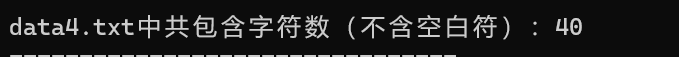 1 #include<stdio.h> 2 int main(){ 3 FILE *fp; 4 long count=0; 5 char t; 6 if((fp=fopen("data4.txt","r"))==NULL){ 7 printf("error\n"); 8 return 1; 9 } 10 while(!feof(fp)){ 11 t=fgetc(fp); 12 if(t==' '||t=='\n'||t=='\t')continue; 13 if(t==EOF)break; 14 count++; 15 } 16 printf("data4.txt中共包含字符数(不含空白符):%d",count); 17 return 0; 18 }