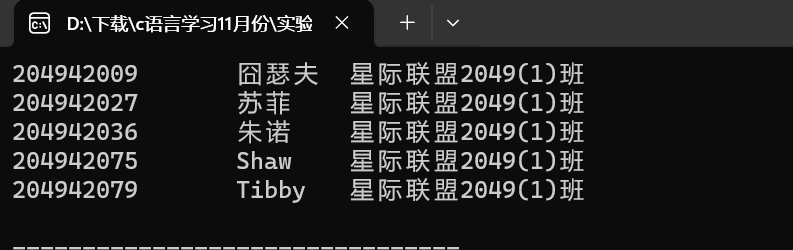 1 #include<stdio.h> 2 #include<stdlib.h> 3 #include<time.h> 4 #define N 5 5 #define N1 1 6 #define N2 80 7 typedef struct { 8 long number; 9 char name[20]; 10 char classname[100]; 11 } STU; 12 void output(STU st[], int n); 13 void finput(STU st[], int n); 14 void randluck(STU st[], int n, STU lucky[]); 15 int main(){ 16 STU stu[N2], lucky[N2]; 17 finput(stu, N2); 18 randluck(stu,N,lucky); 19 output(lucky,N); 20 return 0; 21 } 22 void finput(STU st[], int n){ 23 int i; 24 FILE *fin; 25 fin = fopen("list.txt", "r"); 26 if (fin == NULL) { 27 printf("fail to open file\n"); 28 exit(0); 29 } 30 while (!feof(fin)) { 31 for (i = 0; i < n; i++) 32 fscanf(fin, "%ld %s %s", &st[i].number, st[i].name, st[i].classname); 33 } 34 fclose(fin); 35 } 36 void randluck(STU st[], int n, STU lucky[]){ 37 FILE *fout; 38 int i,j; 39 STU a; 40 // 保存到文件 41 fout = fopen("lucky.txt", "w"); 42 if (!fout) { 43 printf("error\n"); 44 exit(0); 45 } 46 srand(time(0)); 47 for(i = 0; i < n; ++i) 48 lucky[i].number=204942000+rand()%(N2 - N1 + 1) + N1; 49 for(i=0;i<n;++i) 50 for(j=0;j<N2;++j) 51 if(lucky[i].number==st[j].number) 52 lucky[i]=st[j]; 53 for(i=0;i<n-1;i++){ 54 for(j=0;j<n-i-1;j++){ 55 if(lucky[j].number>lucky[j+1].number){ 56 a=lucky[j]; 57 lucky[j]=lucky[j+1]; 58 lucky[j+1]=a; 59 } 60 } 61 } 62 for (i = 0; i < n; i++) 63 fprintf(fout, "%ld%s%s",lucky[i].number,lucky[i].name,lucky[i].classname); 64 65 fclose(fout); 66 } 67 void output(STU st[], int n){ 68 int i; 69 for(i=0;i<n;i++){ 70 printf("%ld\t%s\t%s",st[i].number,st[i].name,st[i].classname); 71 printf("\n"); 72 } 73 }