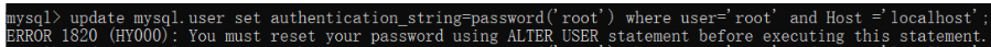 mysql> update user set authentication_string=PASSWORD('root') where User='root'; #密码为root