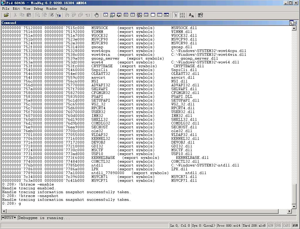 打开windbg,按F6,附加报警服务器进程。在命令行里面输入!htrace–enable开启htrace功能。输入!htrace –snapshot做第一个快照,然后输入g命令,让程序执行一段时间。