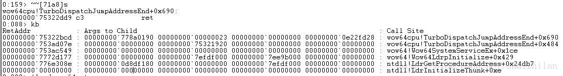输入~~[71a8]s,切换到这个线程,并输入kb打印其调用栈,如下图: