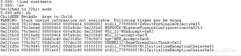调用栈是一堆非常奇怪的数据,其实是因为我的系统是64位的,而报警服务器这个进程是32位的,windbg使用64位的上下文去解析32位的进程,造成了错误的解析。这时可以通过!sw这条命令来切换至32位的上下文。然后再敲入kb命令,就能看到该线程的调用栈了,如图: