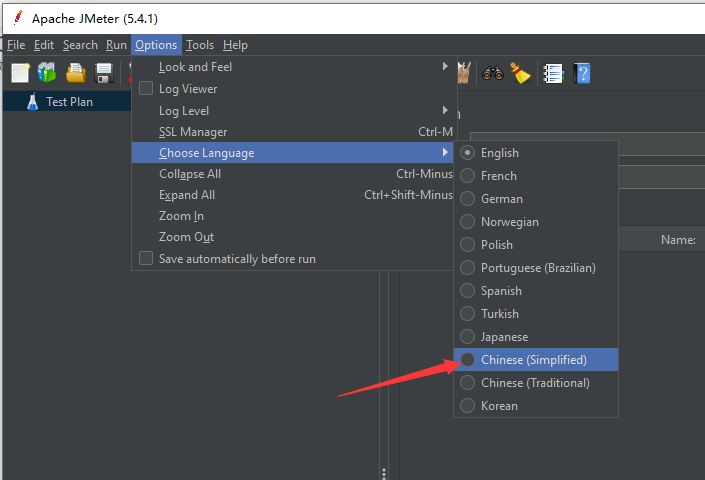 启动后,默认情况下,界面语言选用的English,这里有2种方式进行切换。