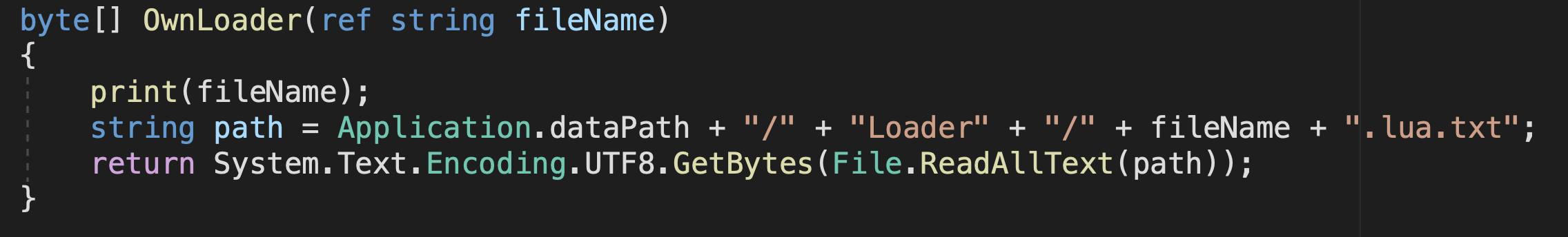 首先xlua中在AddLoader的时候委托了一个函数这个函数会返回一个byte数组从而得到lua中文件的内容我们来看代码