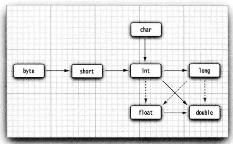 上图展示了合法的类型转换(转换可以自动进行),其中,虚线表示可能会丢失精度。反之,则需要强制类型转换。