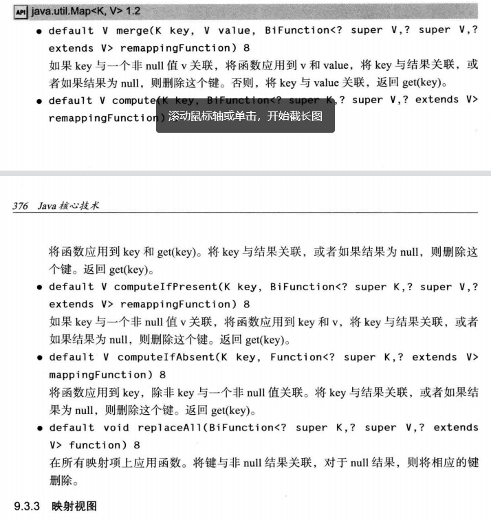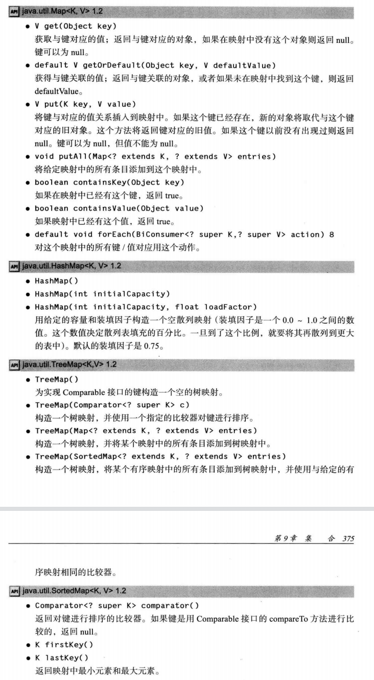 集合框架不认为映射(map)本身是一个集合。但可以得到对应映射的视图(view)——这是实现了Collection接口或某个子接口的对象。map的视图有三种,分别是键集(Set)、值集合(Collection)以及键/值集(Set)。获取方法为: