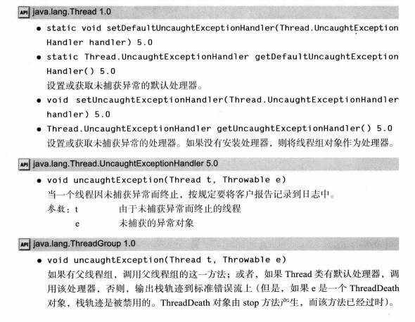 于是,可以用setUncaughtExceptionHandler为线程安装处理器,也可以用Thread类的静态方法setDefaultUncaughtExceptionHandler为所有线程安装一个默认的处理器。该处理器可以使用日志API发送未捕获异常报告到日志文件。