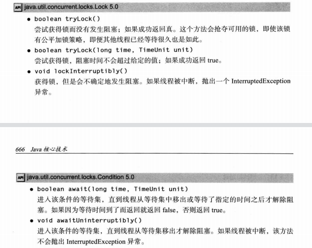 lock方法使线程在等待时也不能被中断,而tryLock在等待状态时被中断(或等待前中断标志为true)将会抛出InterruptedException异常,这种特性可以用来打破死锁。如果需要这个特性,但又不想指定一个时间期限可以使用lockInterruptibly()方法,它会返会一个可以中断等待线程的锁。相当于一个时间无限的tryLock()方法。